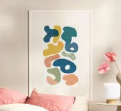 A collection of smooth, abstract, pebble like shapes in a pleasing palette of white, yellow, teal, and blue, creating a playful and modern pattern that is both organic and graphic.