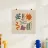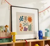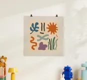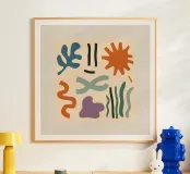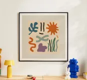 A playful, Maraoui inspired abstract composition of colorful organic shapes, including leaves, a sun, and other forms, floating on a neutral background.