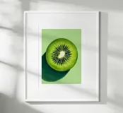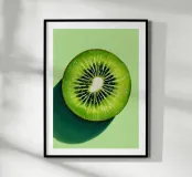 A crisp pop art illustration of a juicy kiwi slice with radiant lime tones and glossy seeds casting a long shadow on a soft mint background. Clean shapes and watercolor texture create a fresh kitchen vibe for modern homes cafés and juice bars, perfect for fruit lovers and summer themed interiors.