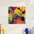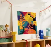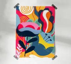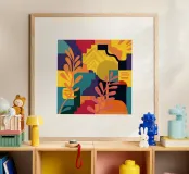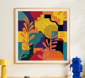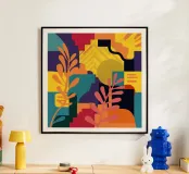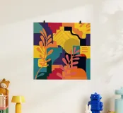 A bold abstract composition of stylized leaves and geometric shapes in primary colors of yellow, red, and blue, creating a vibrant and structured design.