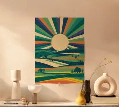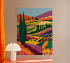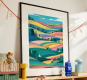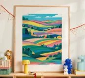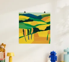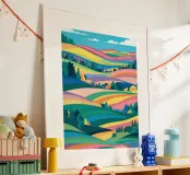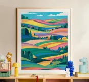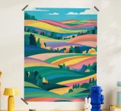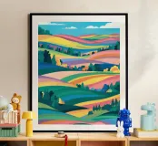 A beautiful landscape of rolling hills and fields, rendered in a colorful patchwork of greens, blues, pinks, and yellows, evoking a sense of idyllic countryside.