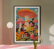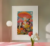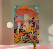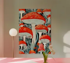 A colourful, psychedelically inspired work of art with huge, imaginative mushrooms in bright colours such as orange, pink, purple and yellow. This scene looks like something from a dream forest full of magic and joie de vivre. Ideal as an eye-catching mural for creative living spaces, galleries or lounges - for anyone who is inspired by colour, nature and surrealism.