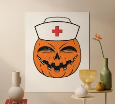 A jack-o'-lantern with a mischievous grin wears a crown made of candy corn. The pumpkin is dressed in a luxurious fur-trimmed robe, reinforcing its regal theme. Bold text beneath the image reads "PUMPKING."