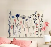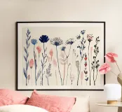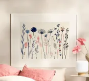 A delicate arrangement of inky stems and petal-soft washes, this minimalist floral composition captures the quiet poetry of a windswept meadow. Soft reds and deep indigos evoke both stillness and movement in nature’s gentle rhythm.