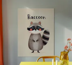 Charming wooden framed art print featuring a whimsical raccoon design by Dieter Braun. Perfect for adding a playful touch to children's bedrooms or nurseries.