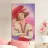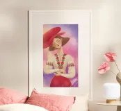 This painting features a person wearing a large red hat and a white blouse with red embroidery. The background is a dreamy mix of pink and purple hues, adding a whimsical touch.