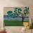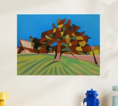 A solitary tree with broad green leaves stands in the forefront against a background with shades of blue, suggesting distant hills or mountains. The field is a vibrant green with brushstrokes visible throughout, and the sky has a beige tint, giving the scene a simplistic, almost childlike quality.