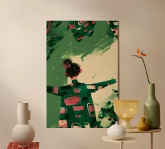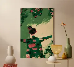 An expressive figurative composition capturing movement in its rawest form. Elongated proportions and outstretched arms create a dynamic silhouette, while bold, imperfect brush strokes build rhythm across the surface. Deep forest green grounds the piece, interrupted by coral gestures and textured layers that refuse precision. Visible marks, uneven edges, and spontaneous strokes embrace imperfection as energy rather than flaw.