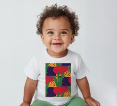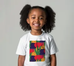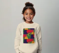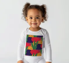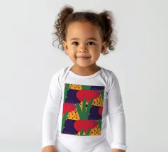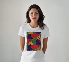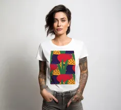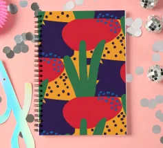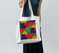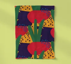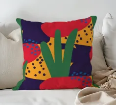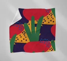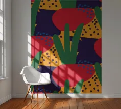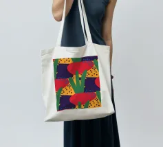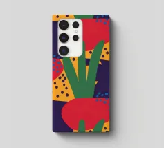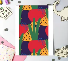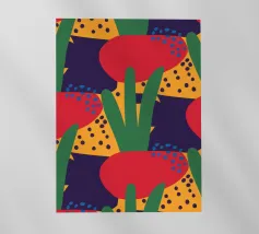A vibrant and eclectic pattern featuring stylized red creatures, possibly foxes or cats, interspersed with colorful vases and plants. The composition is a playful and imaginative tapestry of recurring motifs.