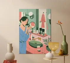 A vibrant depiction of a person looking into a mirror while applying makeup. The intimate moment exudes a sense of vibrancy and self-expression.