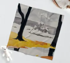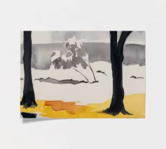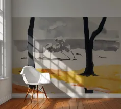 A minimalist, moody landscape where the stark, bare trees of winter are reflected perfectly in the still water of a marsh or lake, creating a symmetrical, melancholic scene.