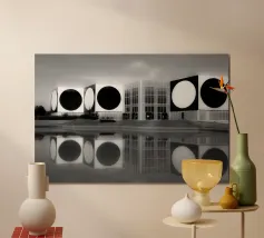 Explore the striking elegance of 'Reflets Modernistes', a stunning wooden framed art print that brings a contemporary touch to any room. Perfect for living rooms, offices, or modern decor enthusiasts, this artwork captures the essence of architectural beauty in a monochromatic palette, ideal for adding sophistication and depth to your space.