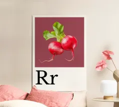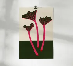 Set on a neutral, cream background, this elegant illustration of rhubarb adds sophistication to any kitchen, cafe or dining area. This minimalist yet informative design will spark conversation in any setting, adding a refined touch to your environment.