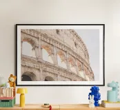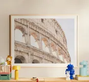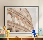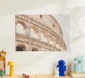 Admire the Colosseum in Rome captured on a summer's morning in soft light with pastel tones and aesthetics. This artistic photograph highlights the symmetry of the ancient Roman arena with a minimalist, geometric and vintage style. Ideal for lovers of architecture, history and elegant, timeless wall decoration. A perfect mural to enhance an interior with a Mediterranean and urban touch, highlighting a passion for Rome, the dolce vita, heritage and the authentic beauty of ancient ruins.
