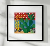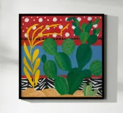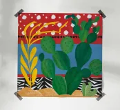 A vibrant collection of stylized cacti in colorful pots is set against a bold red background featuring a whimsical pattern of lights or beads, creating a playful and modern botanical composition.