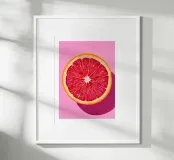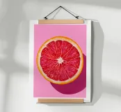 Vibrant pop art illustration of a halved ruby grapefruit on a soft pink background with a crisp shadow. Fresh citrus tones and watercolor texture create bright modern kitchen decor. Adds a sunny Mediterranean vibe to breakfast nooks cafes and summer dining spaces.