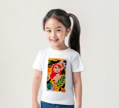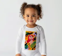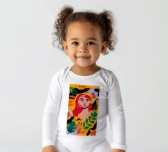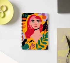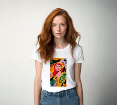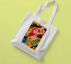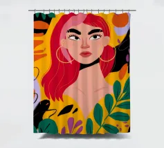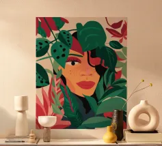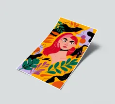 A portrait of a woman with flowing red hair, surrounded by stylized leaves and flowers, looking thoughtfully to the side. The style is modern, bold, and slightly art nouveau.