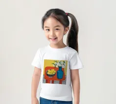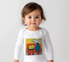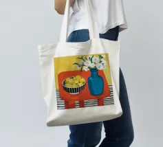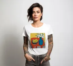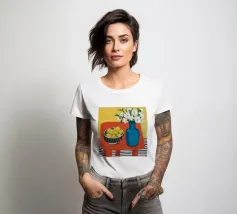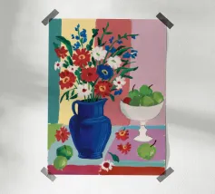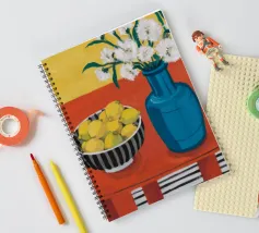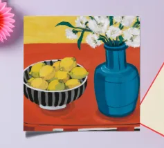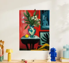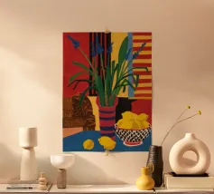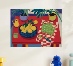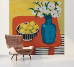 An inviting still life on a bright red table, featuring a bowl of lemons and a blue vase holding delicate white flowers. The warm yellow background enhances the cozy and vibrant atmosphere.