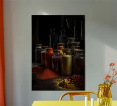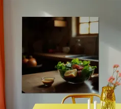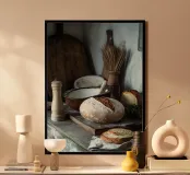 A warm, detailed motif showing a traditional kitchen scene with fresh farmhouse bread, flour, herbs and wooden elements. This picture appeals to all those who appreciate rural cosiness, craftsmanship and culinary tradition. Ideal for kitchens, bistros or catering areas with rustic charm. It evokes memories of home-made delicacies and the simple life.