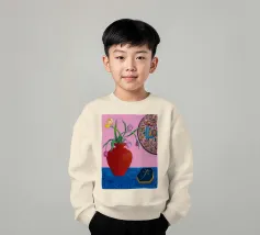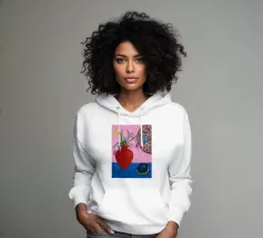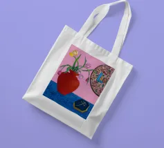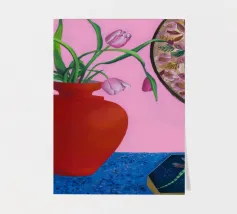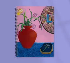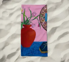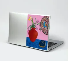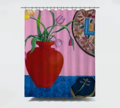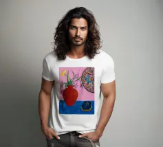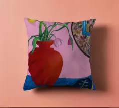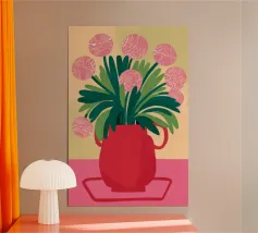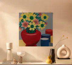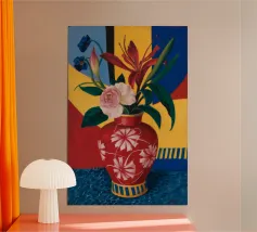 A bold red vase, filled with various flowers, sits on a blue patterned surface, with a dynamic pink and patterned background creating a richly textured and colorful composition.