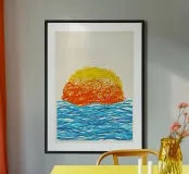 Dive into pure creative energy with this wildly expressive abstract seascape. A sun composed of chaotic, overlapping scribbles in fiery orange and golden yellow appears to dissolve into the atmosphere above rolling blue ocean waves. The frenetic line work creates a sense of heat shimmer and emotional intensity, as if the artist captured not just the scene but the feeling of standing before nature's spectacle. This piece celebrates spontaneity and raw artistic gesture, perfect for contemporary spaces that embrace bold, unconventional beauty and creative freedom.