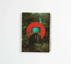 A surreal digital collage blending nature, technology and existential detachment. A faceless figure with a retro CRT monitor for a head, standing in a tropical jungle. The screen reads "YOU'RE OFFLINE" — a quiet rebellion against hyperconnectivity. With strong contrasts, vibrant colors, and a striking red sun behind the subject, this piece captures the feeling of disconnection in an overconnected world. Perfect for fans of botanical surrealism, modern collage art, and digital escapism.