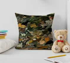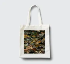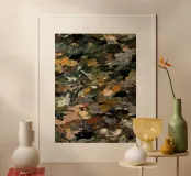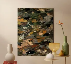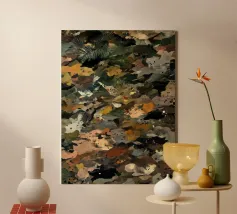 An expressive, layered composition inspired by the shaded forest floor beneath a thick pine canopy. Muted golds, ochres, coal blacks, and dark greens blend in energetic brushstrokes, mimicking the filtered light, moss, bark, and decomposing leaves of a hidden woodland world.