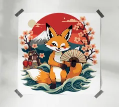 A fox warrior in dark samurai attire stands atop a rocky cliff with a katana, framed by a striking red sun and stylized Japanese pines.