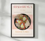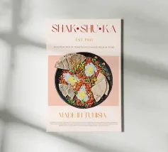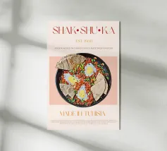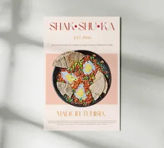 Set on a neutral, cream background, this elegant illustration of the famous Tunisian breakfast dish shakshuka adds sophistication to any kitchen, cafe or dining area. This minimalist yet informative design will spark conversation in any setting, adding a refined touch to your environment.