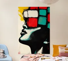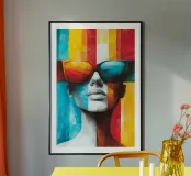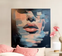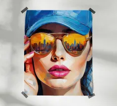 This artistic portrait plays with duality and contrasts. The split half of the face shows cool blue tones on one side and warm earth tones on the other, while the oversized sunglasses reflect the worlds of colour. Vertical colour stripes reinforce the symmetry and create an almost surrealistic effect. A work that captures the changeability of perception and the coexistence of opposing emotions.