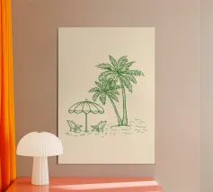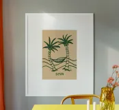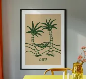 Transform your living space with the 'Siesta' wooden framed art print by Studio Dolci. This charming design features whimsical palm trees and a hammock, perfect for adding a touch of relaxation and tropical flair to your decor. Ideal for living rooms, bedrooms, or calming spaces.