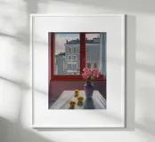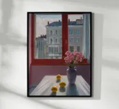 A vase of pink flowers on a pristine white table reflects gentle morning light against a bold red window, evoking delicate peace.