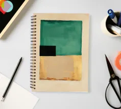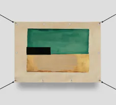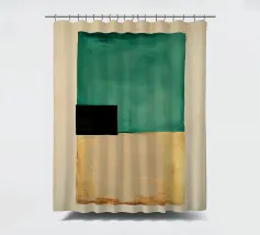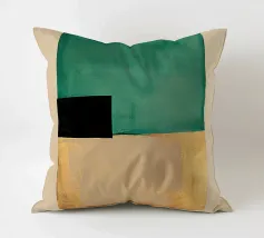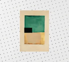 Minimalist painting in the style of white on a beige background, three rectangular colour fields in emerald green and black with gold leaf accents. One field is monochrome and the other two fields have subtle colour gradients. Minimalism, painting.