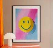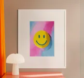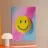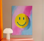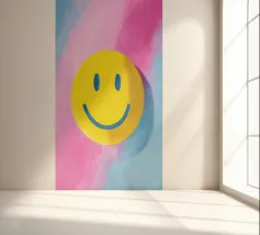 Buntes Smiley auf pink-blauem Hintergrund, handgemalt im minimalistischen Öl-Stil. Perfekt für Kinderzimmer, Kinderbücher oder fröhliche Raumdekoration. Leuchtende Farben, einfache Formen und traumhafte Szenen für gute Laune.