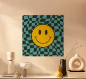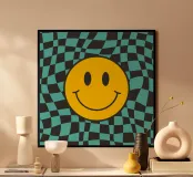 Add a touch of fun to your space with this vibrant 'Smiley and Wavy Checker' poster, featuring a cheerful smiley face against a wavy checkerboard backdrop. Perfect for brightening up any room, this artwork combines playful aesthetics with a modern twist.