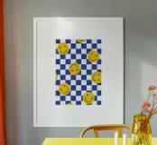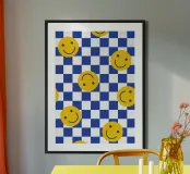 Brighten your space with the 'Smilies Blau' wooden framed art print, featuring cheerful smiley faces in a vibrant blue and yellow design. Ideal for adding a fun touch to living rooms, kids' rooms, or play areas, this print is a delightful decor piece that sparks joy.
