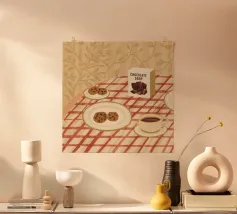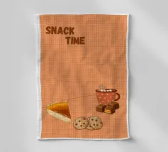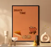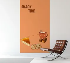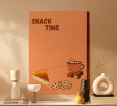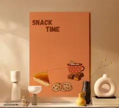 "Snack Time" Dessert Poster! A cozy, appealing illustration featuring a slice of pumpkin or pecan pie, chocolate chip cookies, caramel chocolates, and a mug of hot chocolate with a gingerbread man marshmallow. This design is perfect for adding a warm and cozy touch to a kitchen, dining room, or cafe area. The orange background and rich food colors create an inviting, comfort food atmosphere. Ideal wall art for lovers of desserts and a relaxing snack! Snack Time, Dessert, Pie, Pumpkin Pie, Cookies, Hot Chocolate, Chocolate, Gingerbread, Kitchen decor, Dining room, Food art, cozy, war