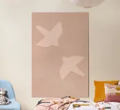 Minimal silhouettes of two birds in flight, floating gently across a soft pink sky, evoking calmness and quiet freedom.