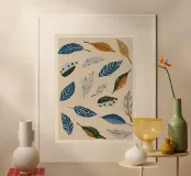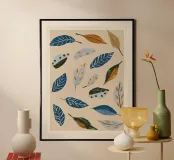 Discover the Soft Wind Leaf Scatter poster featuring elegant abstract botanical leaves in calming blue, beige, and ochre tones. Ideal for living room wall art, this non-personalised print adds a fresh and modern touch to your home decor. Printed on high-quality, FSC-certified paper ensuring durability and vivid colours, perfect as a thoughtful gift or stylish home upgrade.