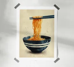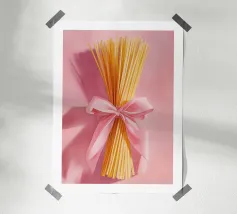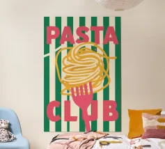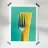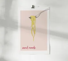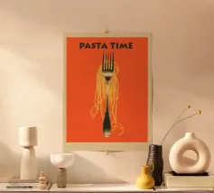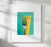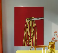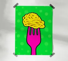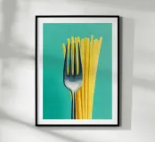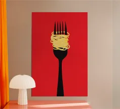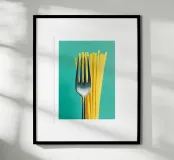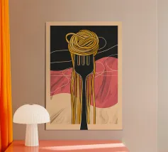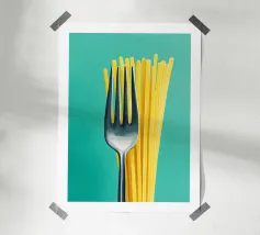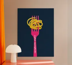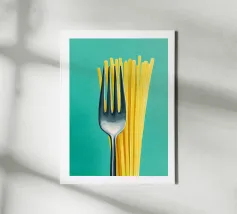 A bold minimalist illustration of a silver fork placed against a bundle of bright yellow spaghetti on a teal background. Clean shapes and crisp shadows give it a modern pop art feel. Perfect kitchen wall art poster for Italian food lovers dining nooks and contemporary interiors.