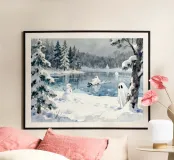A playful winter scene where ghosts glide gracefully across a frozen pond under a pale moon. The icy surface glimmers with eerie reflections, and snow-dusted trees frame the background.