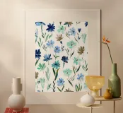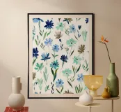 Loose watercolor florals in soft blues, mint greens, and earthy taupes scatter across a crisp white background. This breezy composition captures the lightness and spontaneity of spring wildflowers in bloom.