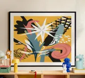 An energetic abstract collage combines a bold star shape with colorful scribbles and patterns, creating a playful, imaginative, and celestial-themed piece of art.