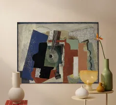 A modern abstract painting featuring geometric shapes forming guitars, violins, and musical notes in a bold, colorful composition. The textured background and dynamic arrangement evoke a sense of rhythm and artistic expression.