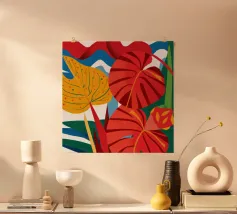 An abstract botanical composition where different types of leaves, some with bold stripe patterns, overlap. The play between solid colors and patterns creates a modern and graphic piece.