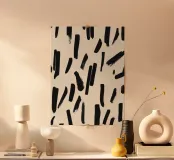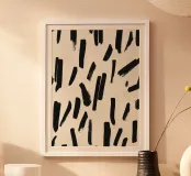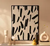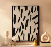 Bold black brushstrokes scatter across a soft ivory ground, creating a dynamic interplay of movement and negative space. Minimal yet expressive, the composition celebrates the raw gesture of mark-making.