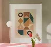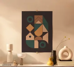 An abstract artwork of geometric shapes in earthy green, orange, and beige tones, arranged with balance on a textured light background.