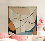 This painting features an abstract composition with flowing lines and shapes, using a muted color palette of beige, brown, and blue. The artwork is subtle and elegant, creating a sense of harmony and balance.