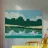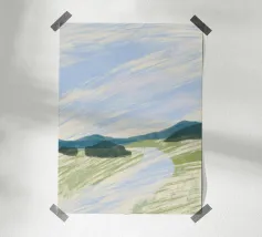 Lush green hills are juxtaposed against a sky filled with fluffy white clouds, while below, their reflection is mirrored on the rippling water. The image uses a simple color palette and abstract shapes to evoke a serene landscape scene.