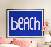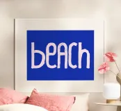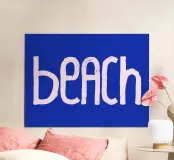 Beach handwritten in pink on a blue background.